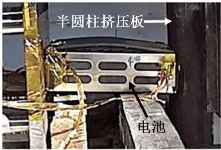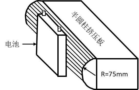 模拟电池在新能源汽车碰撞时发生强力挤压和变形引起内部短路的场景。半径 75mm 的半圆柱体挤压板以(5±1) mm/s 的速度垂直于蓄电池极板方向施压,直到电池电压达到 0V 或变形量达到 30%或挤压力达到 200kN 后停止挤压,电池应不起火,不爆炸。图 6、7 为动力电池挤压仿真与实验原理。