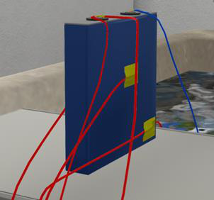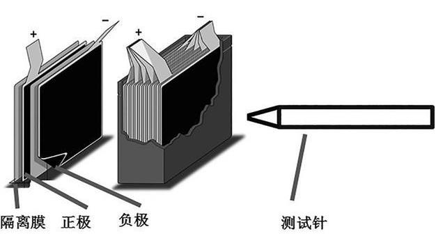 模拟动力电池在新能源汽车碰撞时遭遇尖锐物体刺穿导致内部短路的场景; 用直径 5mm~ 8mm 的耐高温钢针以(25±5)mm/s 的速度,从垂直于蓄电池极板的方向贯穿,贯穿位置靠近所刺面的几何中心,钢针需要停留在蓄电池中超过一分钟,电池应不起火,不爆炸。图 4、5 为动力电池针刺仿真与实验原理。