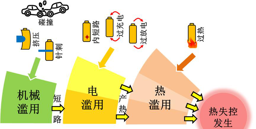 动力电池热失控主要由于机械滥用、电滥用和热滥用诱发,如图 3 所示,三类滥用诱发热失控存在一定的耦合关系。首先机械滥用导致电池变形,而电池变形会引发内部短路,转变为电滥用过程;电滥用伴随着焦耳热和化学反应热的生成,转变为热滥用过程;热滥用过程造成电池温度持续上升,引发动力电池热失控链式反应,最终导致热失控的发生。