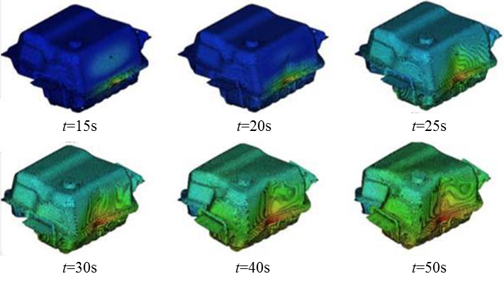 动力电池热扩散过程的温度场能够被重构,下图为一款方形电池在针刺条件下和一款电池包在挤压条件下发生的电池热扩散和最终恢复到室温的过程。动力电池安全测试虚拟仿真平台能够高精度仿真电池在热失控之前的热扩散过程并采集电池实时仿真数据、出具电池安全实验报告。电池安全实验仿真能够以安全、低成本的方式在优化电池生产过程、改进电池包成组方式和电池包散热系统设计等方面提供重要指导意义。