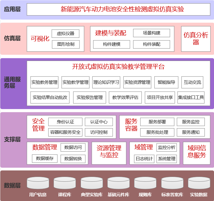 新能源汽车动力电池安全性检测虚拟仿真实验项目涉及到多种类型虚拟实验组件及数据,这里分别设置虚拟实验的基础元件库、实验课程库、典型实验库、标准答案库、规则库、实验数据、用户信息等来实现对相应数据的存放和管理。